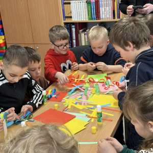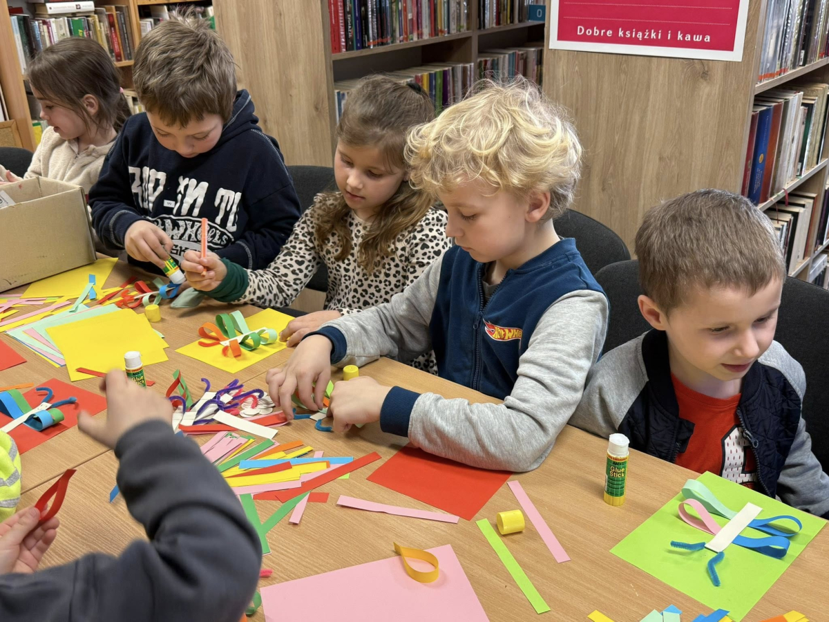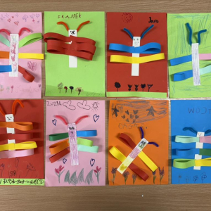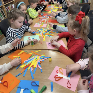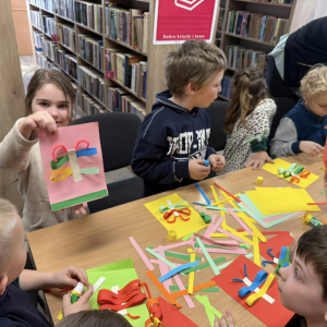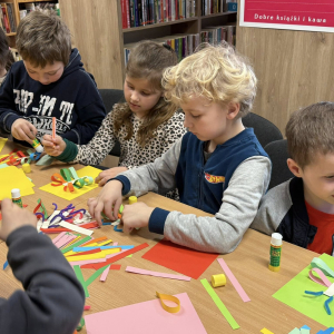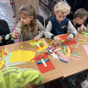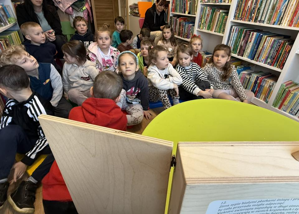 Lekcje biblioteczną rozpoczęliśmy od teatrzyku kamishibai. Była opowieść o zmieniających się porach roku oraz historia małej gąsienicy, która zamieniła się w dorodnego motyla.